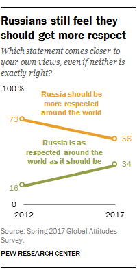 Most Russians still believe their country doesn’t get the respect it deserves, but fewer feel this way now than in the past. Today, 56% of the Russian public thinks Moscow should be held in higher esteem around the world. About a third believes Russia gets the proper amount of respect, which is up from just 16% in 2012, the last time the question was asked.