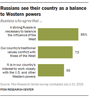Many Russians see inherent conflict in their relationship with the West, but few rule out cooperation. According to a recently released Pew Research Center report based on 2015 survey data, overwhelming majorities in Russia believe that their country serves as an important counterbalance to the West (85%) and that Russian values clash with Western values (73%).