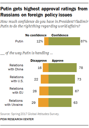 Russian President Vladimir Putin gets high marks on foreign affairs. Overall, nearly nine-in-ten Russians say they are confident in their president’s ability to do the right thing in world affairs, with 58% expressing a lot of confidence.