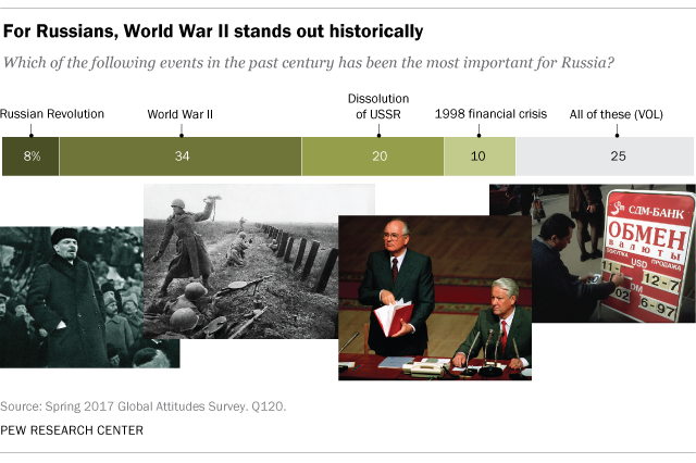 After World War II, 20% of Russians rank the dissolution of the USSR as the single most significant event of the past 100 years. Just one-in-ten cite the country’s 1998 financial crisis. However, a quarter of the public volunteers that all four of the events tested were equally important historical developments for their nation.