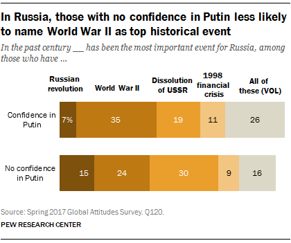 Views of events in Russia’s history differ by the level of confidence in President Vladimir Putin. Russians who trust Putin to do the right thing on the world stage are more likely than those who express no confidence to name World War II as the most important event of the past century (35% vs 24%). This may reflect Putin’s efforts to promote the war as a defining moment for the Russian nation. Among the small share who express no confidence in Putin, the top historical event is the dissolution of the Soviet Union (30%), not World War II.