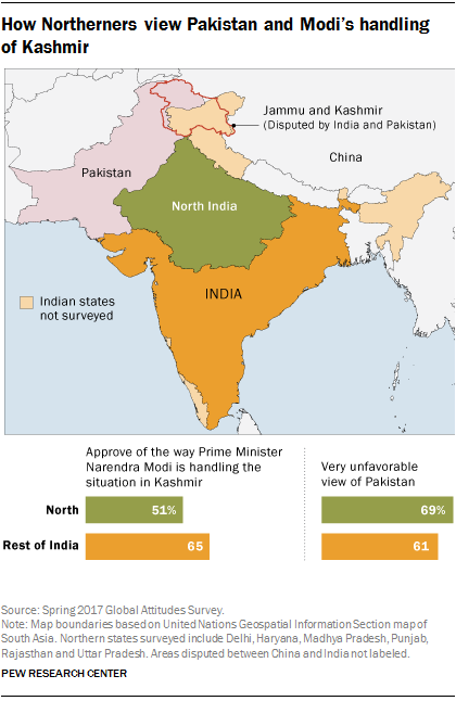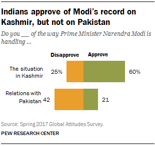 Indian Prime Minister Narendra Modi’s approach to Pakistan isn’t popular, but his handling of Kashmir is. Modi has shown a willingness to use both diplomacy and military force to engage Pakistan. But despite Modi’s overall popularity in India (88% see him favorably), only 21% of Indians approve of the way he is handling relations with Pakistan. This has stayed roughly constant since 2015, when the question was first asked. In contrast, a clear majority (60%) of Indians approve of Modi’s approach toward Kashmir. Indians ages 18 to 29 are more likely to approve of Modi’s management of the Kashmir situation than those ages 50 and older (64% versus 51%).