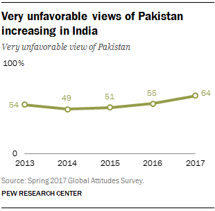 People in India have grown increasingly negative in their views of Pakistan. As of spring 2017, 72% of Indians see Pakistan unfavorably. Almost two-thirds (64%) have a very unfavorable view of Pakistan, the highest level recorded since Pew Research Center began measuring in 2013. This dislike cuts across party lines: Supporters of the Bharatiya Janata Party and the rival Indian National Congress party both have a very unfavorable view of Pakistan (70% and 63%, respectively). Only 10% of Indians see Pakistan favorably.