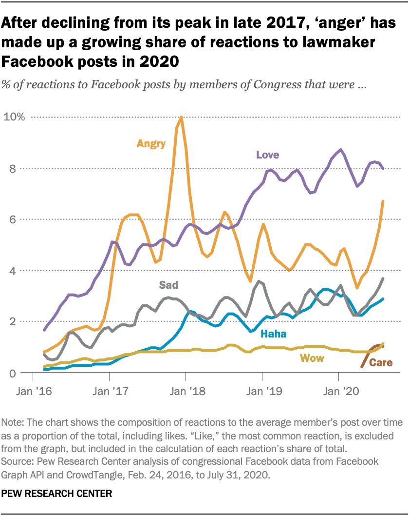 DownloadAfter declining from its peak in late 2017, ‘anger’ has made up a growing share of reactions to lawmaker Facebook posts in 2020 ← Prev Page 1 2 3 Next Page →