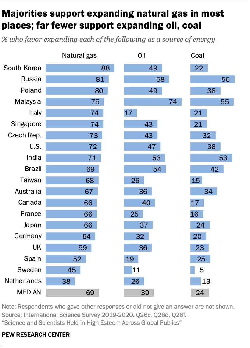 Majorities support expanding natural gas in most places; far fewer support expanding oil, coal