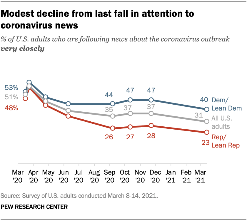 Attention to COVID-19 news drops, but Democrats still substantially more interested than Republicans