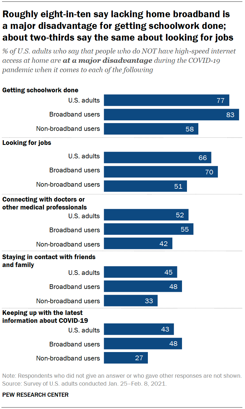 DownloadRoughly eight-in-ten say lacking home broadband is a major disadvantage for getting schoolwork done; about two-thirds say the same about looking for jobs ← Prev Page 1 2 3 4 Next Page →
