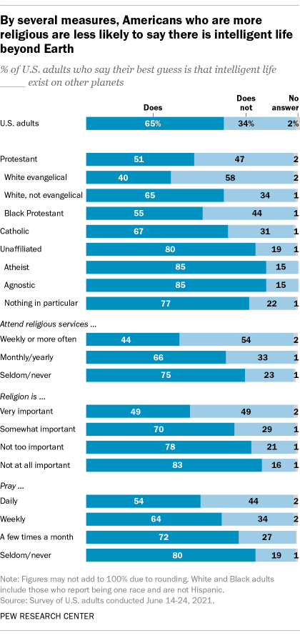 Similarly, around half of Americans who say religion is very important to them (49%) say their best guess is that intelligent life exists on other planets. By comparison, roughly three-quarters of those who say that religion is less important in their lives (76%) say that intelligent life exists elsewhere. Adults who pray daily are also less likely than those who seldom or never pray to say intelligent life exists on other planets (54% vs. 80%).