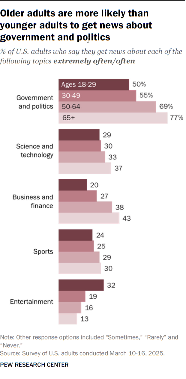 This age difference is most prominent when it comes to news about government and politics. Among Americans ages 65 and older, 77% get this kind of news extremely often or often, compared with half of those ages 18 to 29.