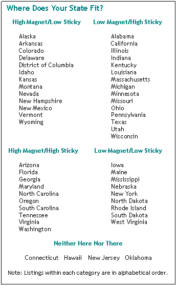 Definition: All in this group rank among the top 25 states on the magnet scale, and the bottom half on the sticky scale. (In the listing of states below, the two numbers after each state show their ranks out of 50 states and the District of Columbia — first on the magnet scale, then on the sticky scale.)