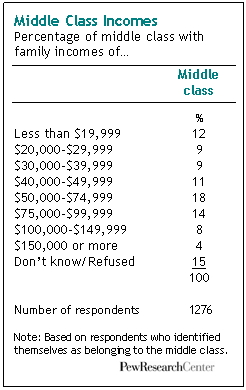 But beyond the simplicity of these numbers lies a nest of anomalies. For example, about four-in-ten (41%) adults with $100,000 or more in annual household income say they are middle class. So do nearly half (46%) of those whose household incomes are below $40,000. As for those in between, about a third say they’re not in the middle class.