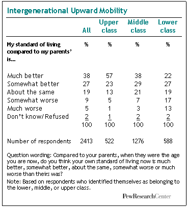 In both of these sets of judgments — short term stagnation, long term progress — those who self-identify as middle class fall out where one would expect on the socio-economic ladder. They are more upbeat about their progress than are those who self-identify with the lower class, but less upbeat than those who self-identify with the upper class.3 This pattern repeats itself on a wide range of questions about personal finances that we posed in this survey. For example, the percentage of people who said they “live comfortably” ranges from 66% of the self-defined upper class to 39% of the self-defined middle class to just 9% of the self-defined lower class. And when we asked people if they had cut back on household spending in the past year because money was tight, 75% of the lower class said they had, compared with 53% of the middle class and just 36% of the upper class.