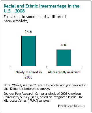 A record 14.6% of all new marriages in the United States in 2008 were between spouses of a different race or ethnicity from each other, according to a Pew Research Center analysis of new data from the U.S. Census Bureau.
