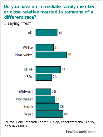All in the Family: About a third (35%) of all adults say they have an immediate family member or close relative who is married to someone of a different race, according to a newly released Pew Research Center survey finding. Whites are less likely than nonwhites to say this (29% versus 50%), and those ages 50 and over are less likely to say this than those under age 50 (26% versus 41%). Also, 44% of adults living in the West say a family member is in an interracial marriage, compared with 38% of those in the South, 31% in the Northeast and 25% in the Midwest.