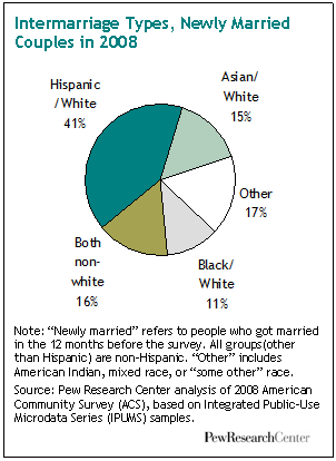 White-Hispanic couples accounted for about four-in-ten (41%) of such new marriages; white-Asian couples made up 15%; and white-black couples made up 11%.