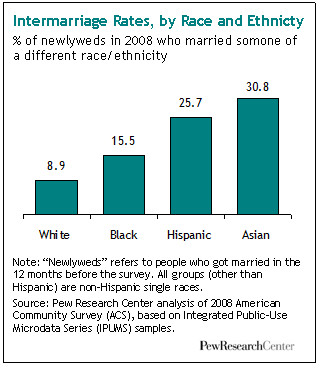 Race, Ethnicity and Immigration: Of the 3.8 million adults who married in 2008, 9% of whites, 16% of blacks, 26% of Hispanics and 31% of Asians married someone whose race or ethnicity was different from their own.