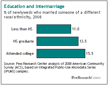 Education: Marrying out is more common among adults who attended college than among those who did not, but these differences are not large. Of all newlyweds in 2008, 15.5% of those who attended college married outside their race or ethnicity, compared with 13.5% of those who completed high school and 11.0% of those who did not complete high school.