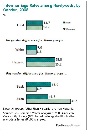 Gender: Among blacks and Asians, there are stark differences by gender in the tendency to marry outside their own racial group. Some 22% of all black male newlyweds in 2008 married outside their race, compared with just 9% of black female newlyweds. Among Asians, the gender pattern runs the opposite way. Some 40% of Asian female newlyweds in 2008 married outside their race, compared with just 20% of Asian male newlyweds.