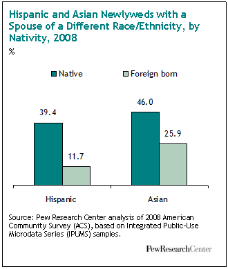 Nativity Status: Marrying out is much more common among native-born adults than among immigrants. Native-born Hispanics are more than three times as likely as the foreign born to marry a non-Hispanic.