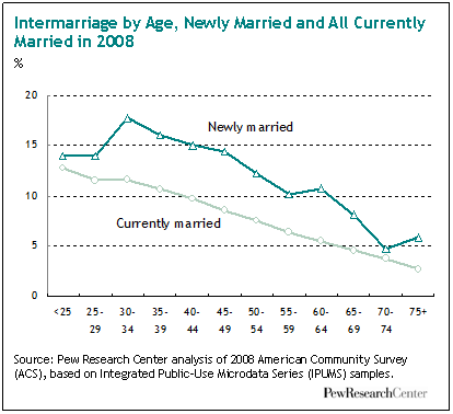 Among newlyweds in 2008, however, the relationship of intermarriage and age is not as strong. The intermarriage rate is around 15 % for newlyweds under age 50 (the vast majority of all newly weds). Rates decline among newlyweds over age 50.