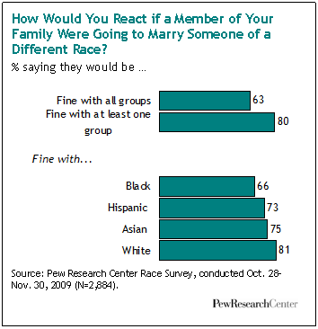 Survey respondents were asked about all major racial and ethic groups except their own. Overall, 63% said it would be fine with them if a family member married “out” to all three other major racial and ethnic groups tested in the survey, and 80% said they would be fine with a new member of their family who came from at least one of the “out” groups.