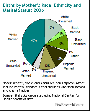 For example, using combinations of marital status and race or ethnicity, the largest group-accounting for 40% of births in 2006 is white, married women. As the previous pie chart shows, no other group accounts for even half that share.