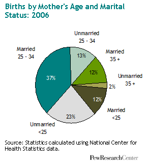 According to the recent “New Demography of American Motherhood” report, 44% of mothers of newborns who were under age 35 were unmarried in 2008, a 51% increase from 1990. Among mothers of newborns who were ages 35 and older, 19% were unmarried in 2008, an increase of 30% from 1990.