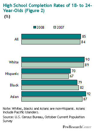 Census data also show that the high school completion rate reached an all-time high of 84.9% in October 2008, and that high school completion rates for both white and Hispanic 18- to 24-year-olds reached all-time highs in 2008.5