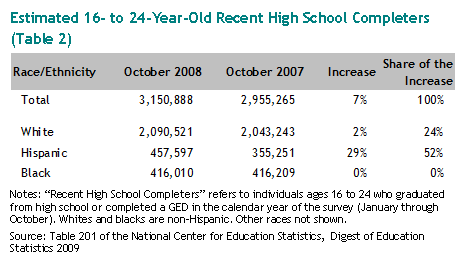However, Census Bureau household surveys provide more timely snapshots that allow for an examination of a closely related indicator: the number of 16- to 24-year-olds who completed high school in the calendar year of the survey. And, indeed, these data indicate that minority youth accounted for much of the growth in the number of 16- to 24-year-olds who recently completed high school. From October 2007 to October 2008, the total number of recent high school completers increased by about 200,000. The estimated number of white recent high school completers increased by about 47,000 over that period, so whites accounted for only about 24% of the growth in the stock of young high school completers. These data strongly suggest that the minority freshman college enrollment spike that occurred from 2007 to 2008 is closely related to the minority high school completion spike that occurred the same year.