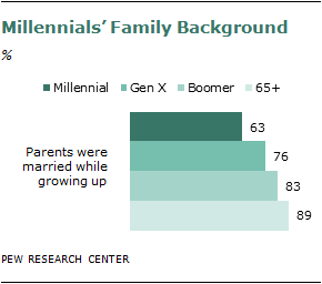 Millennials are less likely than their elders to have grown up in intact families. Asked about their parents’ marital status during most of their own childhood, about six-in-ten (63%) of Millennials say that their parents were married, while 20% say their parents were divorced and 12% say their parents were never married to each other. By contrast, 76% of Gen Xers, 83% of Boomers and 89% of Silent Generation adults say their parents were married most of the time they were growing up.