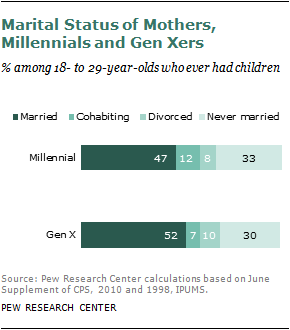Consistent with these trends, young mothers today are more likely than those in the past to be unmarried. Fewer than half (47%) of Millennial mothers are currently married, about one-in-ten (12%) live with a partner and more than three-in-ten (33%) have never married. In 1998, when Gen Xers mothers were 18 to 29, 52% of them were married, 7% were cohabiting, and 30% had never married.