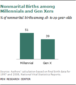 Despite the drop of fertility rate among young adults, the share of nonmarital births has increased. Slightly more than half (51%) of the births among Millennials in 2008 were to unwed mothers. Looking back at Gen Xers about a decade ago in 1997, the rate of birth to unwed mothers was about four-in-ten (39%).