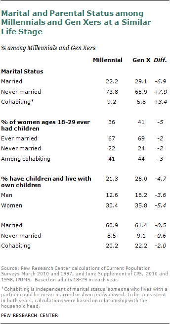 Only 22% of Millennials are currently married, compared with 29% of Gen Xers in 1997. In the meantime, cohabitation rate (that is, the share of adults who are living together without being married) among 18- to 29-year-olds has increased to 9.2% today, from 5.8% in 1997.3