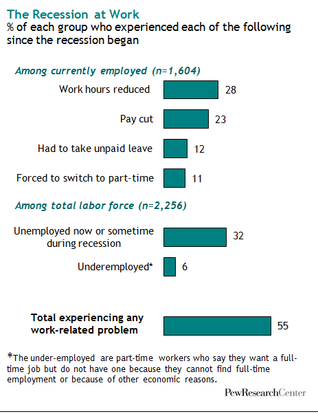 A Pew Research Center survey of the general public in May 2010—during the period covered by the new census figures on poverty, income and health insurance—found that more than half the adults in the U.S. labor force (55%) suffered a work-related hardship since the recession began. These hardships included involuntary reduction in work hours, a pay cut, unpaid leave, a switch to part-time work, underemployment or unemployment, according to the report, How the Great Recession Has Changed Life in America.