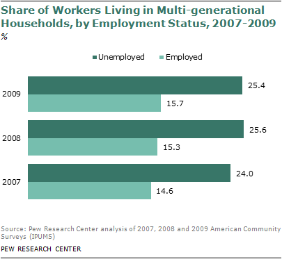 The rapid increase in multi-generational living arrangements during the Great Recession is associated with a spike in unemployment. The unemployed are much more likely than the employed to live in multi-generational households—25.4% vs. 15.7% in 2009. This differential did not change much during the recession, but the number of unemployed people did, increasing by 7.2 million from 2007 to 2009.10