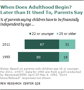 Data from a survey conducted in the early 1990s suggest that public perceptions about when adulthood should begin have shifted significantly over the years. In 1993, 80% of parents with children age 16 and under said children should be financially independent by the age of 22. Now, only 67% of parents with young children share that view.