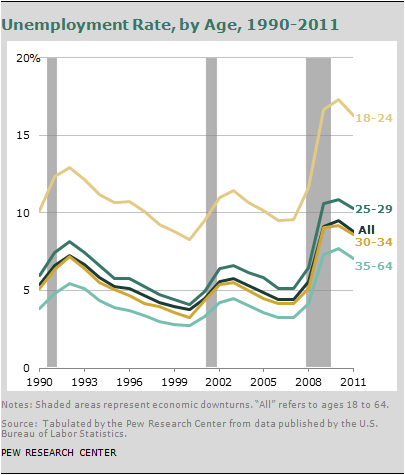 • Unemployment. The unemployment rate at the end of 2011 was 16.3% for 18- to 24-year- olds, compared with 8.8% for all adults ages 18 to 64. In the past three years, the gap in the unemployment rate between 18- to 24-year-olds and all working-age adults is the widest in recorded history.