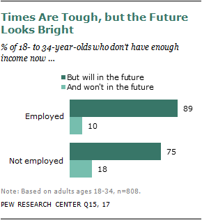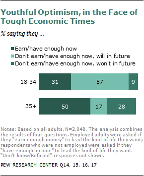 Most young adults (68%), whether they are employed or not, don’t feel they have the resources now to lead the kind of life they want. But among those who are dissatisfied with their current income, the vast majority are optimistic that in the future they will have enough to live comfortably.