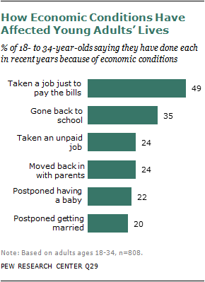 Among adults under age 35, 49% say that due to the bad economy over the past few years, they have taken a job they didn’t want just to pay the bills. More than one-third (35%) have gone back to school. And more than one-in-five have taken an unpaid job, moved back in with their parents, or postponed getting married or having a baby.