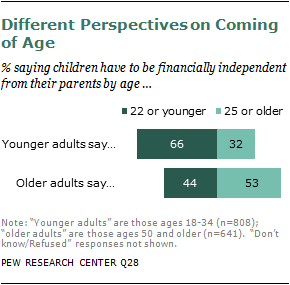 All of this may be contributing to a growing perception that adulthood starts later these days than it did in the past. Survey respondents were asked at about what age children should have to be financially independent from their parents. Among all survey respondents, a narrow majority (55%) say children should be financially independent by the time they are 22 years old (15% say financial independence should come by age 18, 40% place the cutoff at age 22). More than four-in-ten say children do not have to be financially independent until they are 25 or older (34% say children should be on their own by age 25, an additional 8% say age 30 or later).