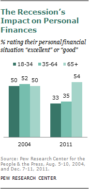 Middle-aged adults have not been immune from the hard economic times. If any group has weathered the storm more easily than others, it has been older adults—those ages 65 and older. Looking at the impact the recession has had on personal finances illustrates this point. In a 2004 Pew Research survey, roughly equal proportions of young, middle-aged and older adults rated their own personal financial situation “excellent” or “good.” When asked again at the end of 2011, the ratings of young and middle-aged adults had fallen dramatically, while the ratings for older adults were virtually unchanged.7