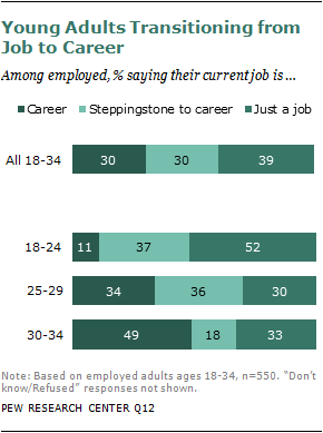 Most young workers (69%) do not view their current job as a career—30% say it is a steppingstone to a career, and 39% say it is just a job for them to get by. Only three-in-ten describe their current job as a career.