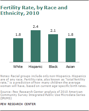 Among Hispanics, the total fertility rate is 2.4. For non-Hispanic whites and for non-Hispanic Asians, it is 1.8. Non-Hispanic blacks (2.1) have higher fertility than whites but lower fertility than Hispanics.