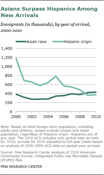 About 36% of new immigrants in 2010 were Asian, compared with 31% who were Hispanic. About 430,000 Asian immigrants arrived in the U.S. in 2010, compared with about 370,000 Hispanics. As recently as 2007, the numbers were about 390,000 (Asians) and 540,000 (Hispanics). These totals include arrivals with both legal and unauthorized status, as well as those arriving with work, student or other temporary visas.18