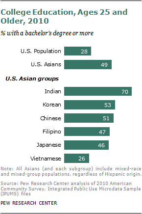 Educational attainment among Asian Americans is markedly higher than that of the U.S. population overall. Among those ages 25 and older, 49% hold at least a college degree, compared with 28% of the U.S. population overall. As with nativity, the share among those ages 25 and older varies by country of origin: Vietnamese (26%) are the only group below the U.S. share, and Indians (70%) are much higher.