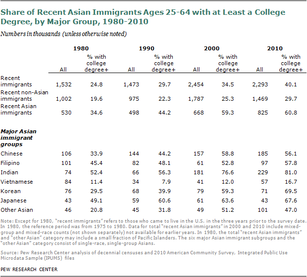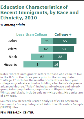 Using a broader measure—the share enrolled in college or holding a college degree—the educational characteristics of recent Asian immigrants also compare favorably with those of other races.