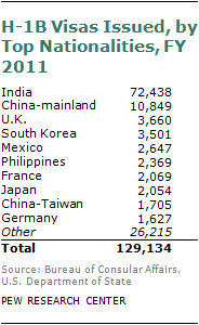 Another facet of the Asian-American occupational profile is the high share of immigrants from Asian countries who are in the U.S. under the H1-B visa program. These visas were authorized under the Immigration and Nationality Act in 1990 to increase the inflow of highly skilled “guest workers” from abroad. Asian countries are now the source of about three-quarters of such temporary visas. In 2011, India alone accounted for 72,438 of the 129,134 H1-B visas granted, or 56%; China was responsible for 10,849, or 8%.