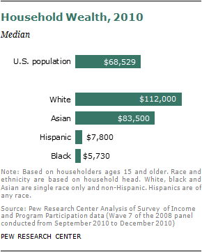Asian-American wealth in 2010 was higher than the median net worth for households overall ($68,529). Compared with other race or ethnic groups, Asian Americans had lower median household wealth than non-Hispanic whites ($112,000). But Asian-American wealth was notably higher than it was for Hispanics ($7,800) or for blacks ($5,730).