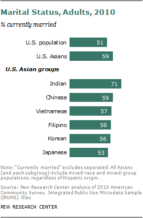 In terms of family structure, Asian Americans are more likely to be currently married than U.S. adults overall and to have lower rates of birth outside of marriage. The current differences reflect in large part the heavy immigrant presence among Asian Americans. As a group, Asian-American adults are more likely to be married than the U.S. population overall—59%, compared with 51%. Among foreign-born Asian-American adults, two-thirds (67%) are married. Among U.S.-born Asian-American adults, 35% are married, in part because they are younger.