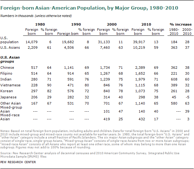 In this report, “Asian American” includes all Asians living in the United States, regardless of citizenship or immigration status. It includes foreign citizens living in the United States for study, work or other purposes, but not those on short-term visits. Unless otherwise noted, the maximum number of Asians is counted for the overall Asian population and for Asian subgroups in the report. This includes single-race Asians as well as mixed-race Asians. Asian Americans do not include Native Hawaiian and Other Pacific Islanders, but (except where specified) do include some Asians of Hispanic ethnicity, who were approximately 1.4% of the Asian population in 2010.